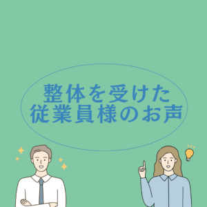 「職場で整体をしてもらえるなんてありがたい!」とのお喜びの声をよく聞きます。肩こり・頭痛や腰痛など気にはなりつつも、なかなか仕事後に出向いて行って整体を受けることができない方も多いのが実態で、それが職場でケアできることに価値を感じていただいています。心身ともにやる気が起こり、作業効率もアップすると喜ばれています。